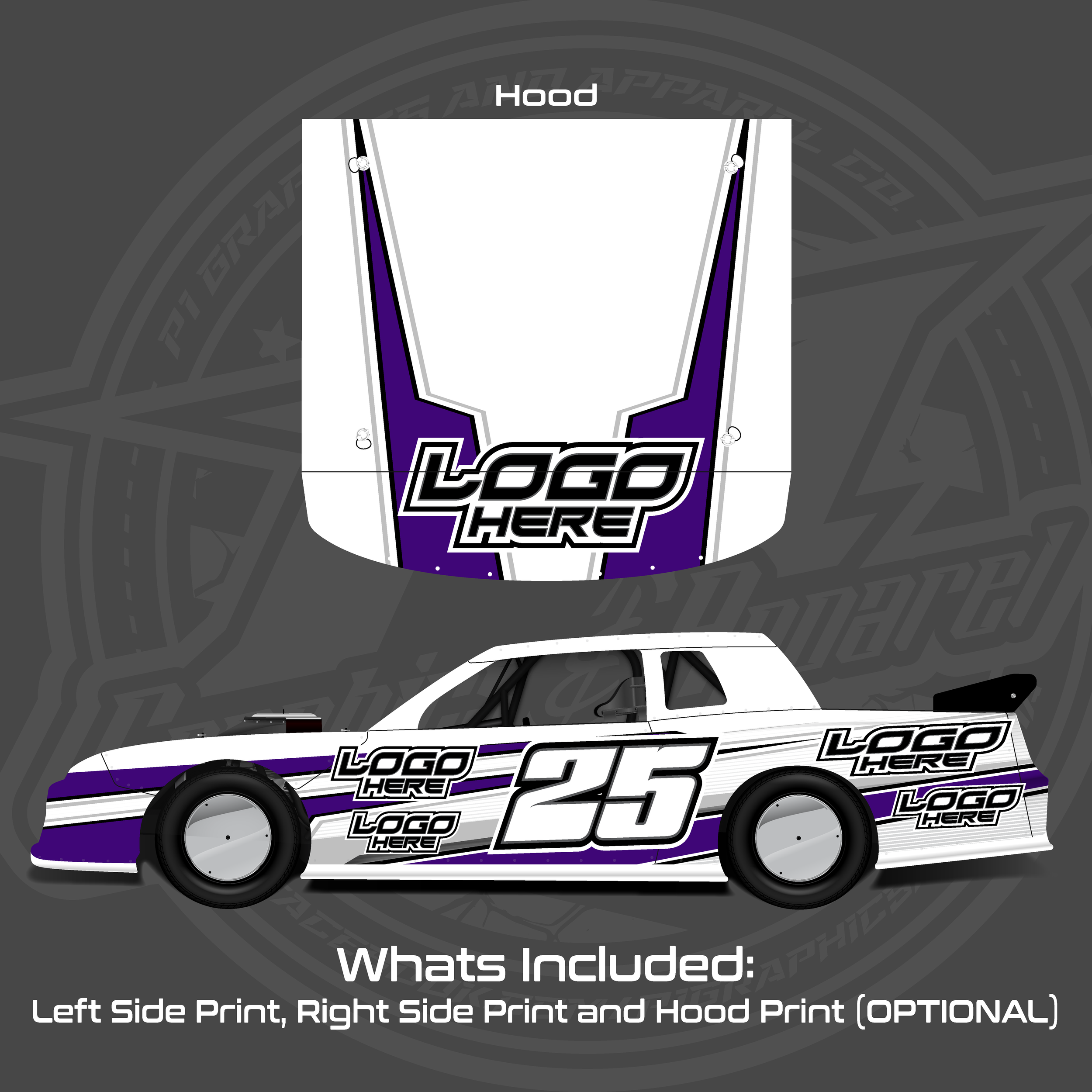 Customize this design with the number, sponsors and colors of your choice. A design proof with your options will be sent within 3-5 business days. Hood print optional. All designs include a nose/filler decal and a roof number. (Colors and other information added when added to cart)